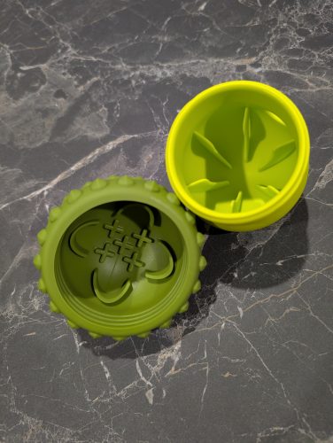Joli distributeur de nourriture en forme de gland en matière silicone de couleur vert clair et vert foncé. Vous pouvez l’utiliser en mettant les croquettes dedans pour que le chien pousse et fasse tomber celles-ci par le trou. Mais vous pouvez l’utiliser aussi en tapis de léchage en remplissant l’intérieur car celui-ci peut s’ouvrir pour que le chien s’occupe deux fois plus. Un outil trop mignon et qui variera comme jouet d’occupation !