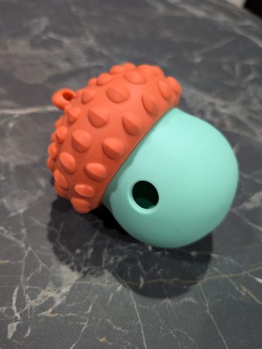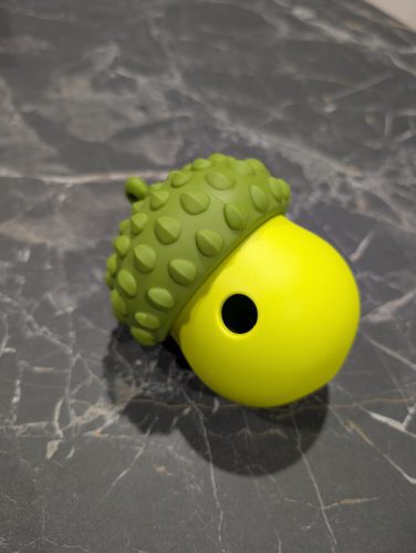 Joli distributeur de nourriture en forme de gland en matière silicone de couleur marron et orange. Vous pouvez l’utiliser en mettant les croquettes dedans pour que le chien pousse et fasse tomber celles-ci par le trou. Mais vous pouvez l’utiliser aussi en tapis de léchage en remplissant l’intérieur car celui-ci peut s’ouvrir pour que le chien s’occupe deux fois plus. Un outil trop mignon et qui variera comme jouet d’occupation !
